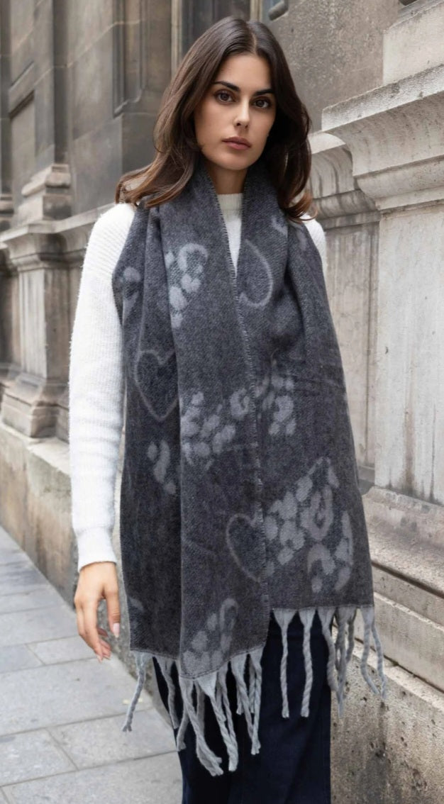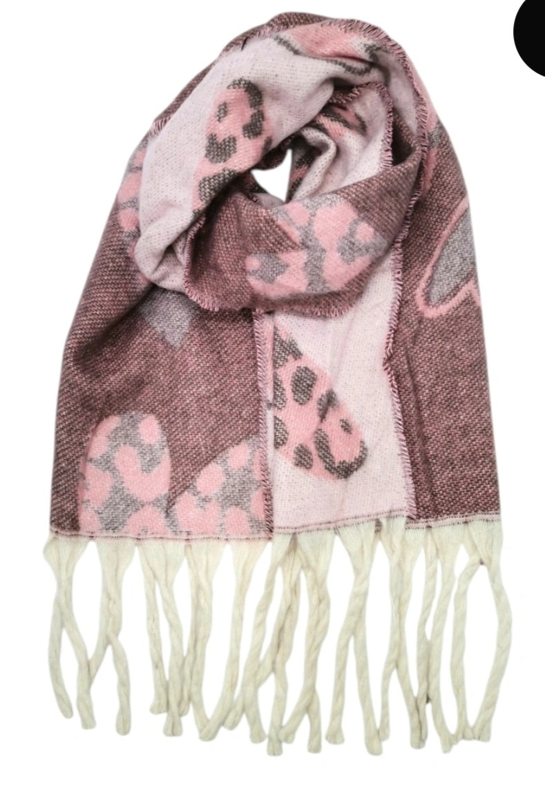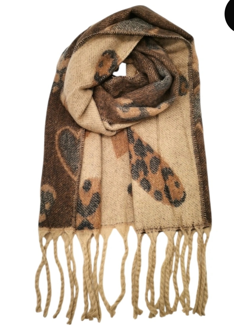 Écharpe épaisse double face à frange motif coeur léopard.